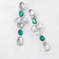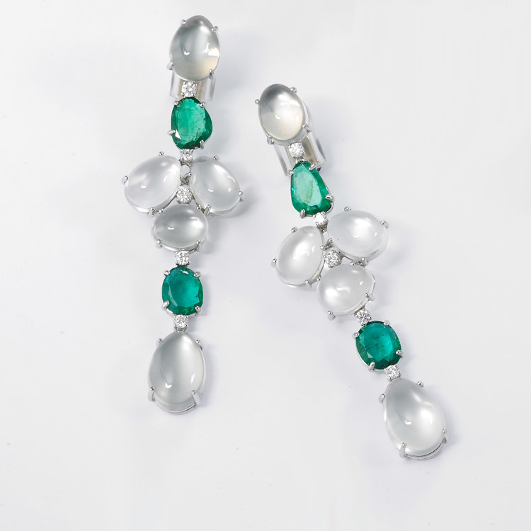 Orecchini in oro bianco, pietra di luna, smeraldi e brillanti